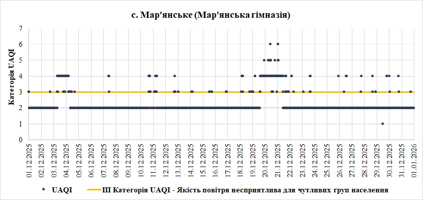 За грудень аналізувались дані зі станції моніторингу яка розташована у селі Мар’янське Криворізького району Дніпропетровської області. Станція має назву «Мар’янська гімназія» та вимірює наступні показники: