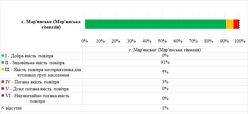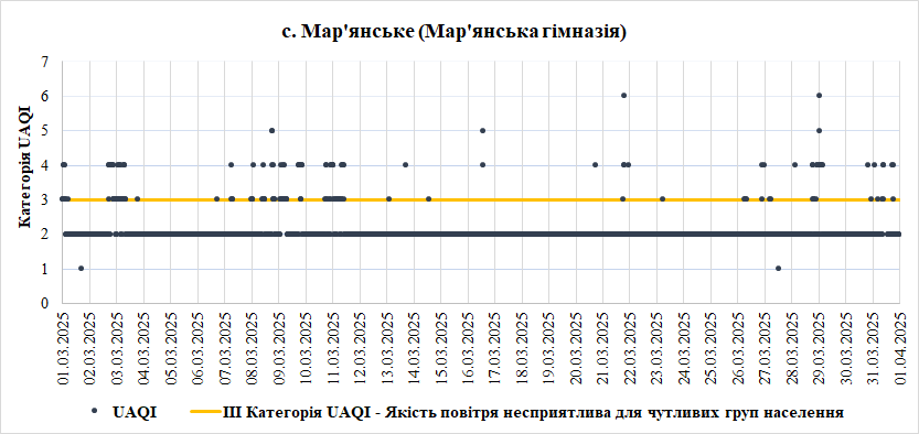 За березень аналізувались дані зі станції моніторингу яка розташована у селі Мар’янське Криворізького району Дніпропетровської області. Станція має назву «Мар’янська гімназія» та вимірює наступні показники: