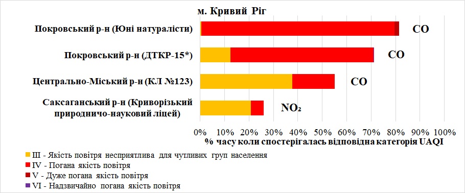 | Станції, на яких якість повітря не перевищувала Ⅲ категорію, або таких значень було менше 5% | 1 | Довгинцівський р-н (Eco-City Кривий Ріг) |