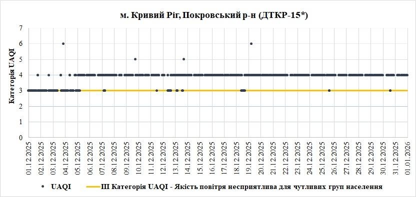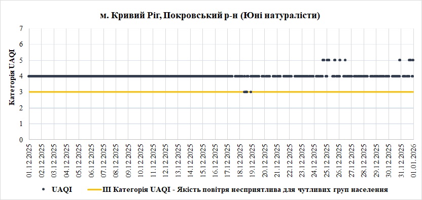 У грудні найгірша ситуація спостерігалась на станціях «Юні натуралісти» та «ДТКР-15*» у Покровському районі. Переважною забруднюючою речовиною, що найчастіше впливала на індекс якості повітря – монооксид вуглецю (СО).