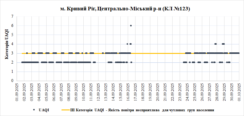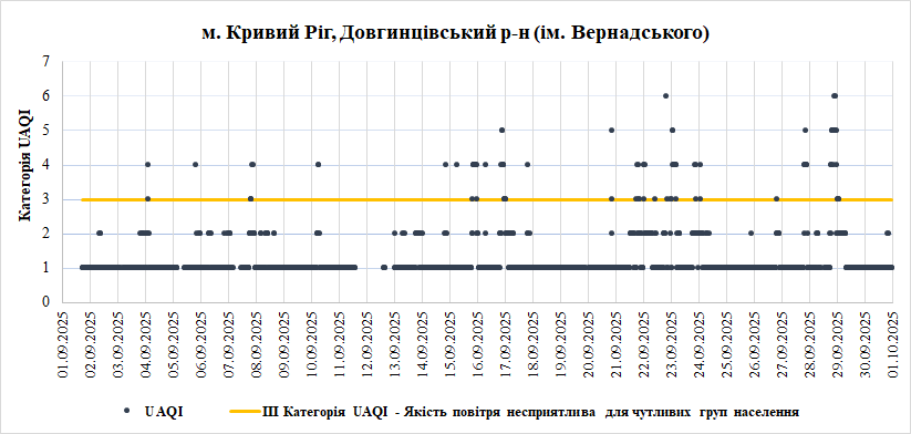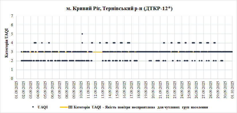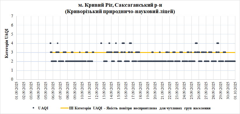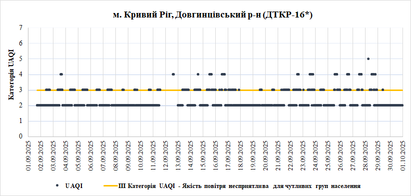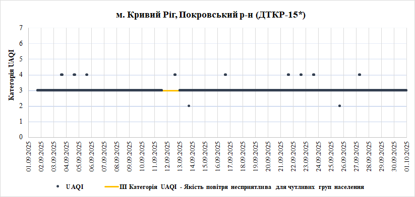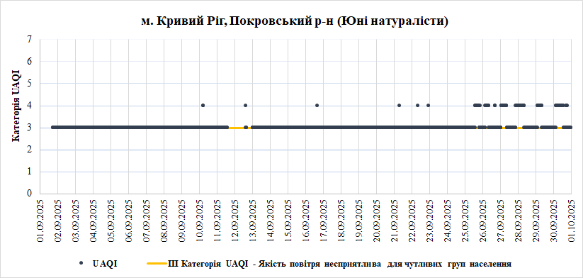 У Вересні найгірша ситуація спостерігалась на станціях «Юні натуралісти» та «ДТКР-15*» у Покровському районі. Переважною забруднюючою речовиною, що найчастіше впливала на індекс якості повітря – монооксид вуглецю (СО).