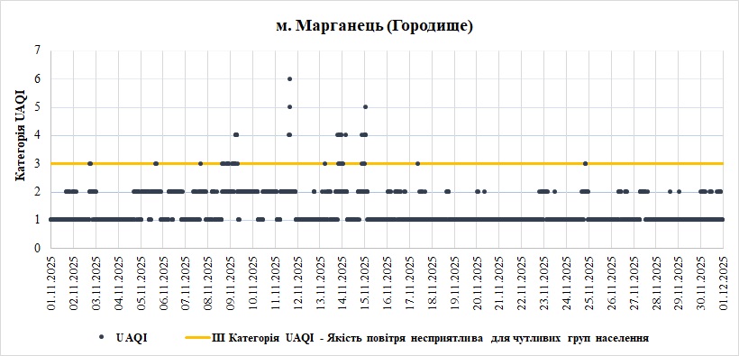 Фахівці з Центру екологічного моніторингу проаналізували якість атмосферного повітря у місті Марганець, на Дніпропетровищині, в листопаді. Дані взяли зі станції Української мережі громадського моніторингу якості повітря Eco City за Листопад 2025 року.