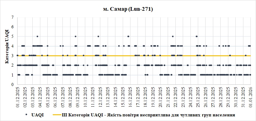За грудень аналізувались дані зі станції моніторингу яка розташована у місті Самар, Дніпропетровської області. Станція має назву «Lun-271», та вимірює наступні показники: