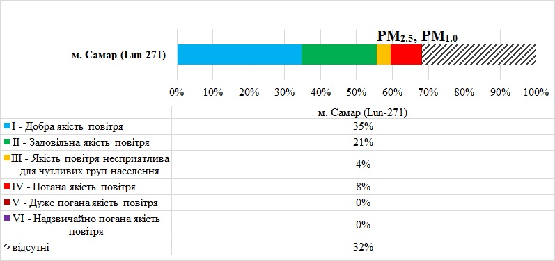 На графіку відображено % часу за місяць коли на станції спостерігалась відповідна категорія якості повітря UAQI, а також, скільки % даних немає.