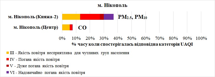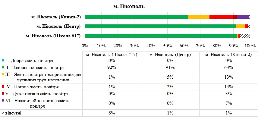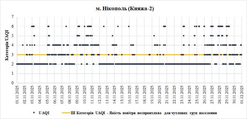 У листопаді на станціях в Нікополі переважно спостерігалась задовільна якість повітря. Найгірша якість повітря фіксувалась на станції «Княжа-2». Переважний забруднювач, що найбільше вплинув на якість повітря на станції – дрібнодисперсний пил (PM2.5, PM10).