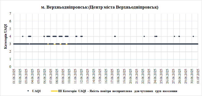 У Червні найгірша ситуація спостерігалась на станції «Центр міста Верхньодніпровськ» (м. Верхньодніпровськ). Переважним забруднюючою речовиною, що найчастіше впливала на індекс якості повітря – монооксид вуглецю (СО).