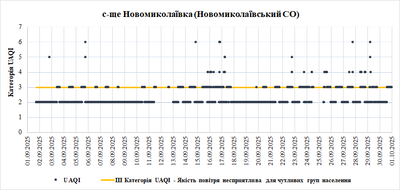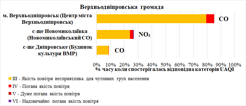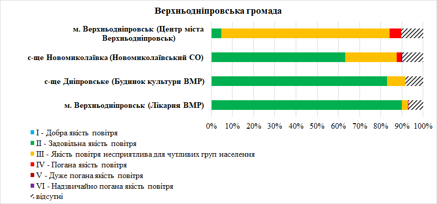 | Станції на яких фіксувалась якість повітря категорії Ⅲ та гірше 5-100% | 3 | с-ще Дніпровське (Будинок культури ВМР); с-ще Новомиколаївка (Новомиколаївський СО);м. Верхньодніпровськ (Центр міста Верхньодніпровськ). |