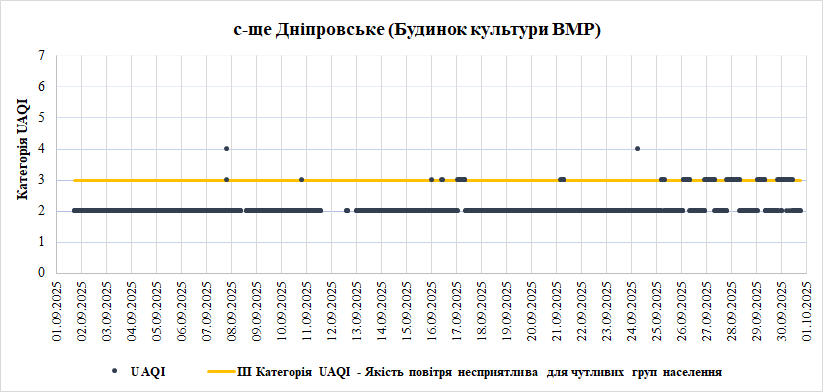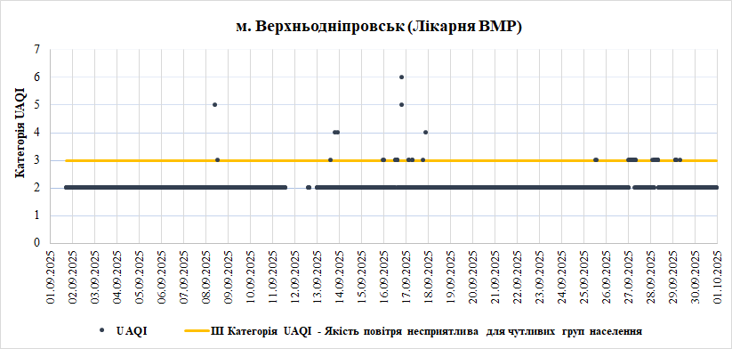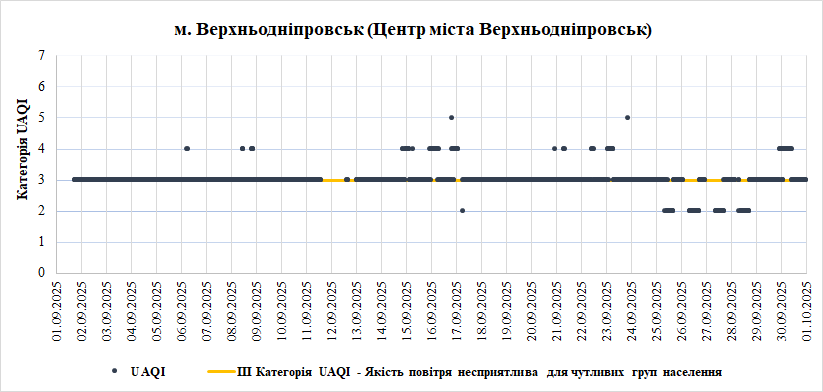 У вересні найгірша ситуація спостерігалась на станції «Центр міста Верхньодніпровськ» (м. Верхньодніпровськ). Переважним забруднювачем, що найчастіше впливав на індекс якості повітря – монооксид вуглецю (СО).