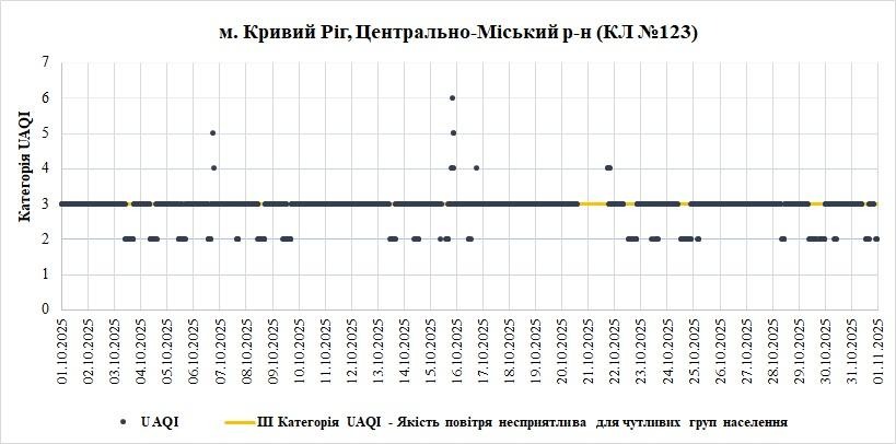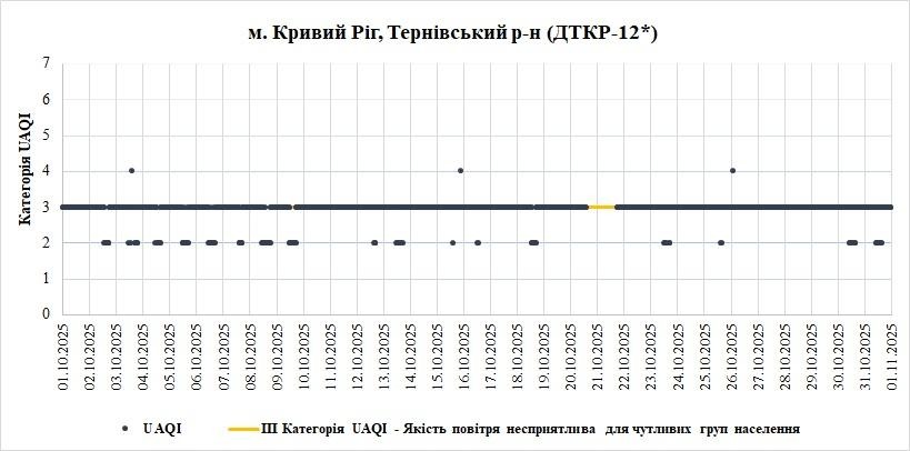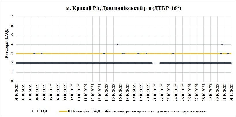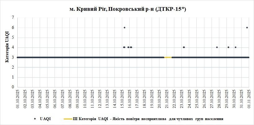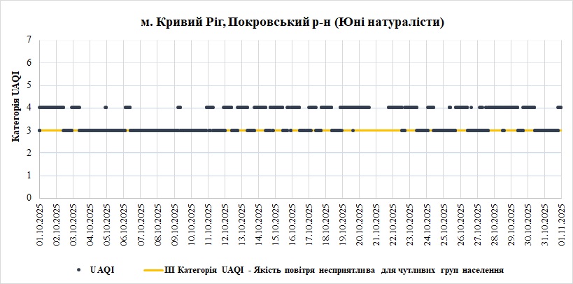У Жовтні найгірша ситуація спостерігалась на станціях «Юні натуралісти» та «ДТКР-15*» у Покровському районі. Переважною забруднюючою речовиною, що найчастіше впливала на індекс якості повітря – монооксид вуглецю (СО).