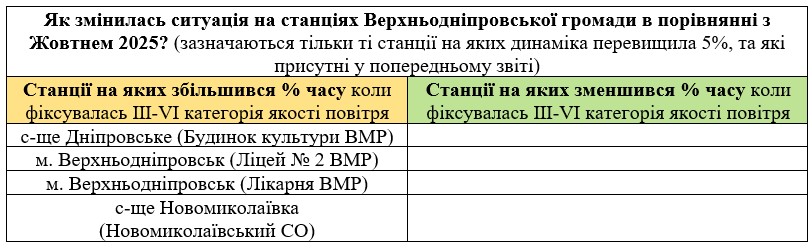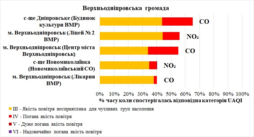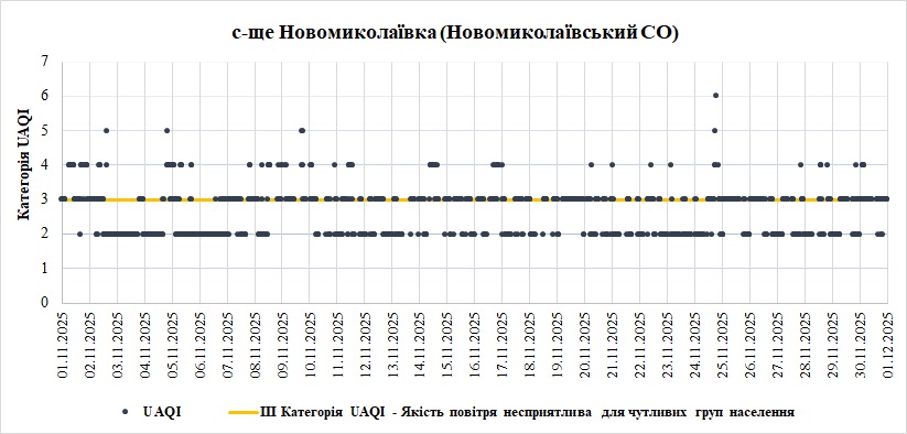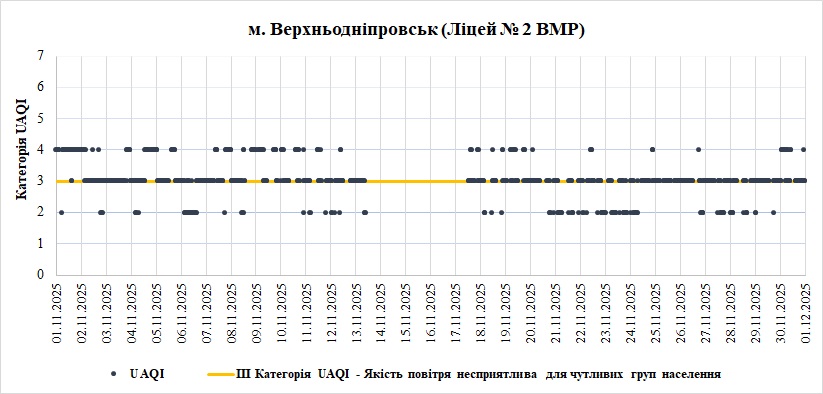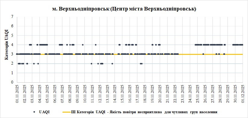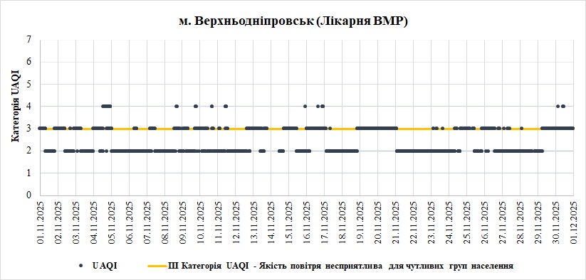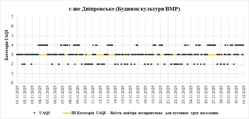 У листопаді найгірша ситуація спостерігалась на станції «Будинок культури ВМР» (с-ще Дніпровське). Переважним забруднювачем, що найчастіше впливав на індекс якості повітря – монооксид вуглецю (СО).