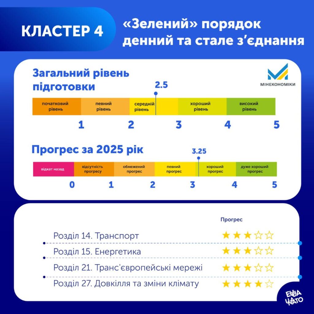 У розділі «Довкілля та зміни клімату», який охоплює понад 200 актів права ЄС у галузях екології, клімату та цивільного захисту, зафіксовано суттєвий прогрес України.