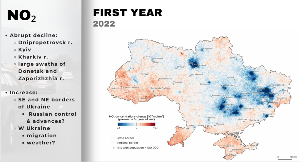 На другому році повномасштабної війни ситуація з NO₂ нагадувала довоєнний період. Наприклад, довкола Києва збільшилася концентрація у північній частині міста. Це, на думку дослідників, демонструє оновлення економічної активності. Так само викиди діоксиду азоту зросли в окупованому Луганську, але зменшилися на заході Донецька.