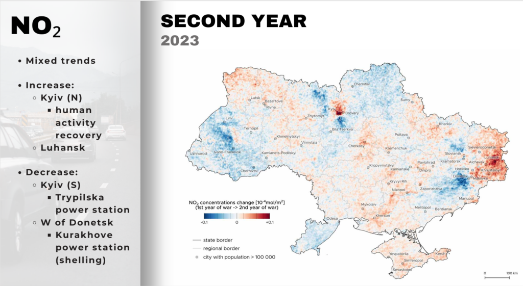 - Протягом 2023–2024 років спостерігається змішана картина. Промислове життя деяких регіонів, наприклад Київського, поступово відновлюється. У цей період дещо знижуються викиди NO₂.