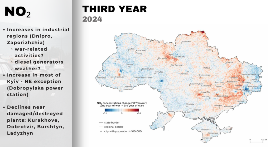 На третьому році повномасштабної війни дослідники World from Space зафіксували збільшення NO₂ по Дніпропетровщині, Харківщині, Запоріжжі. Це здебільшого пов’язано з відновленням промислової діяльності, використанням додаткових енергетичних джерел (бойлерів, генераторів), а також з наслідками вибухів та пожеж. Але важливо враховувати, що метеорологічна різниця між роками може впливати на деякі з цих змін.