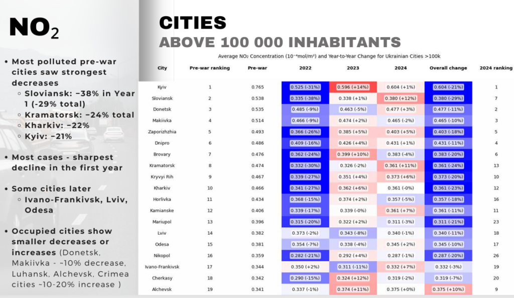 У деяких містах України, таких, приміром, як Бровари, концентрація діоксиду азоту зменшилася в перший рік повномасштабної війни, але збільшилася у другий. А в Івано-Франківську чи Одесі найбільше зменшення спостерігалося у другому–третьому роках війни. Також окуповані росією міста, такі як Донецьк, залишаються забрудненими, а в Луганську можна спостерігати підвищення NO₂.