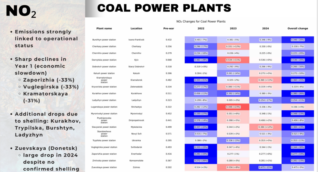 У Києві рівень NO₂ збільшився в деяких частинах, але є зменшення на північно-східній частині України. Це пов’язано з Курахівською електростанцією, яка була закрита в квітні 2023 року, а в 2024 році була перетворена на озброєний пункт і повністю розібрана. Значне зменшення бачимо біля Макіївки, що може бути пов’язане з однією з електростанцій також. Локалізовані зменшення також можна побачити, наприклад, на місцевості, пов’язаній з електростанцією в Бурштині в Івано-Франківську.