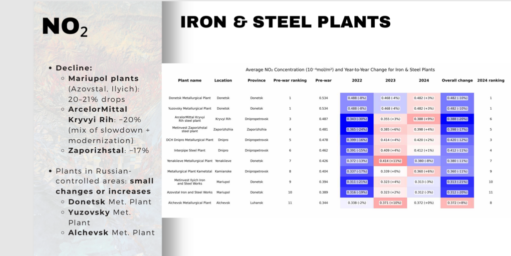 Зміни NO₂ на виробництві сталі дуже сильно залежали від того, чи працює завод. Так, діоксид азоту зменшився у Маріуполі. Падіння його концентрації зафіксували на –20% на АрселорМіттал Кривий Ріг, на –17% на Запоріжсталі. Натомість NO₂ зріс на підприємствах, які контролює росія. Йдеться про Донецький, Юзівський та Алчевський металургійні заводи.