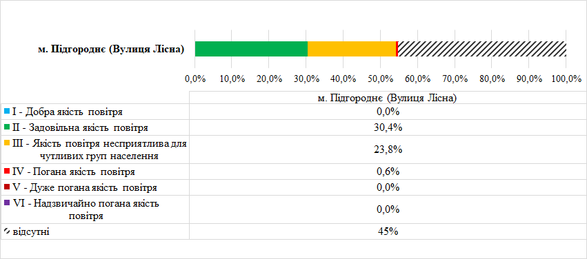 На графіку відображено % часу за місяць коли на станції спостерігалась відповідна категорія якості повітря UAQI, а також, скільки % даних немає.