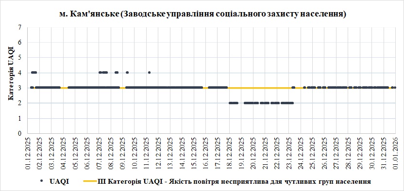 За грудень аналізувались дані зі станції моніторингу яка розташована у місті Кам’янське. Станція має назву «Заводське управління соціального захисту населення», та вимірює наступні показники: