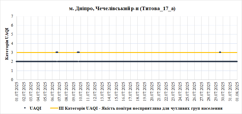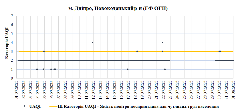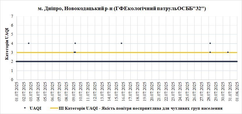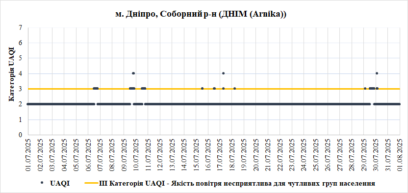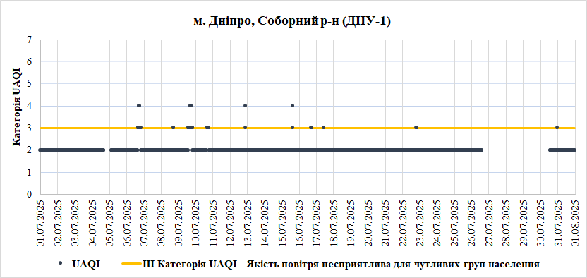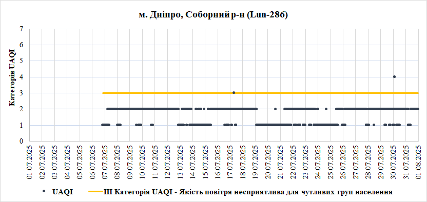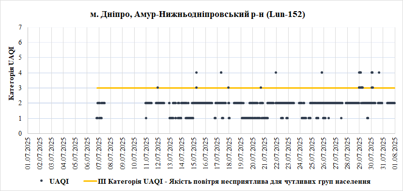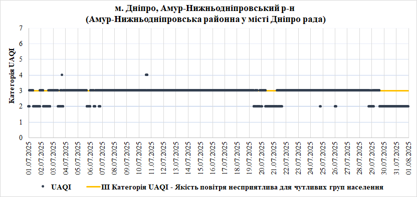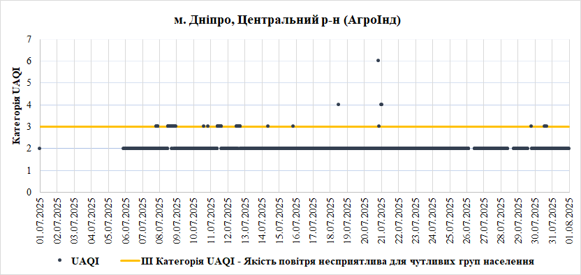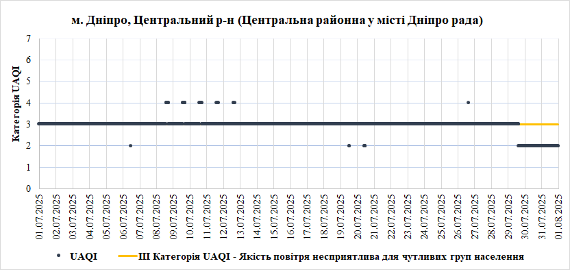 У Липні найгірша якість повітря спостерігалась на станції «Центральна районна у місті Дніпро рада» (Центральний район). Переважною забруднювальною речовиною, що найчастіше впливала на індекс якості повітря – монооксид вуглецю (СО).