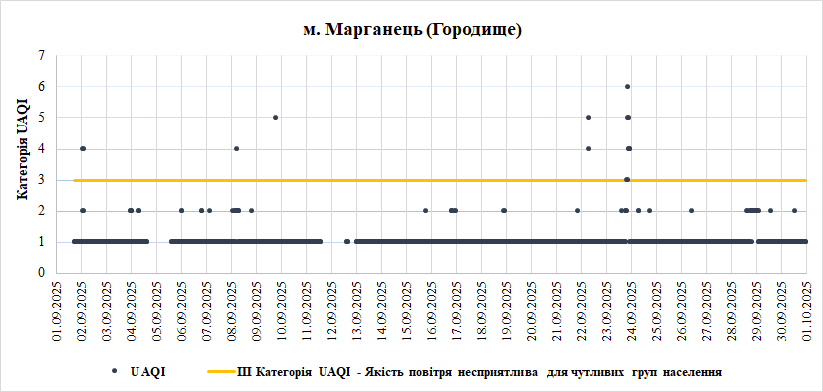 За Вересень аналізувались дані зі станції моніторингу яка розташована у місті Марганець. Станція має назву «Городище», та вимірює наступні показники: