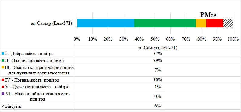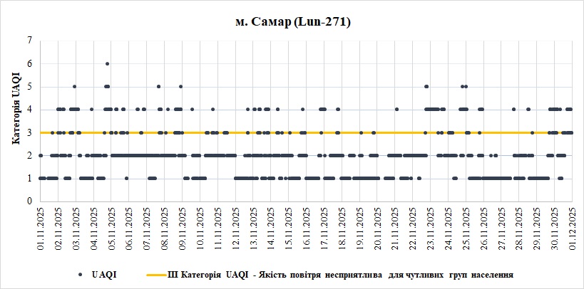 Експерти ЦЕМ проаналізували якість атмосферного повітря у місті Самар, на Дніпропетровщині, в листопаді.  Дані взяли зі станції за даними Української мережі громадського моніторингу якості повітря Eco City за Листопад 2025 року