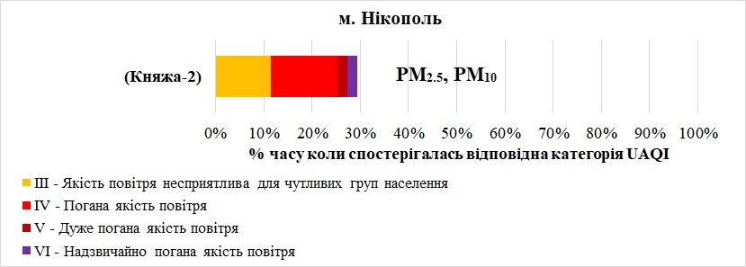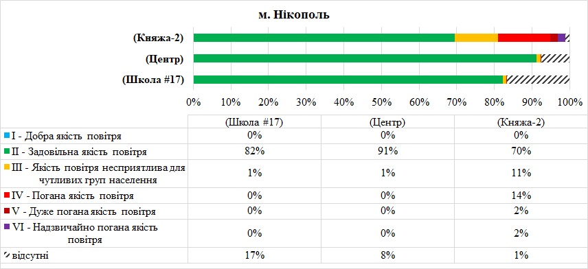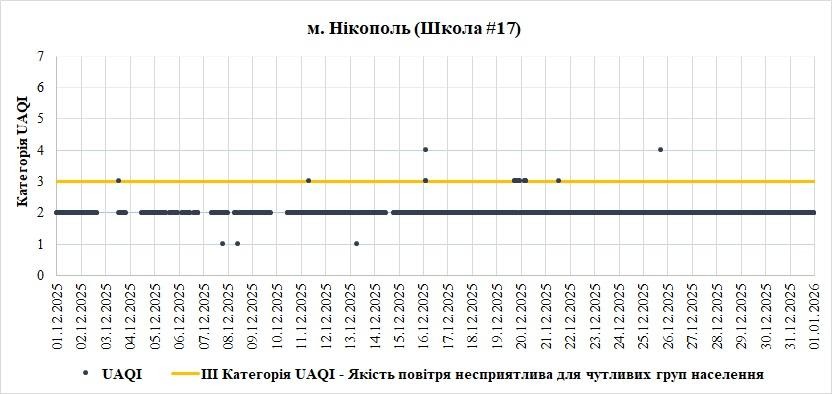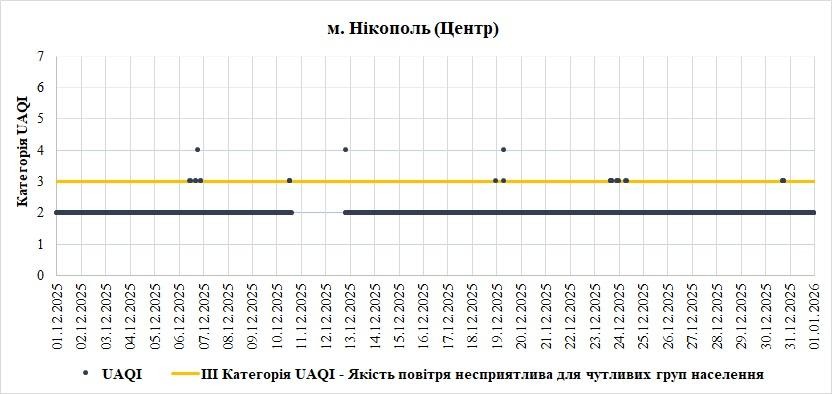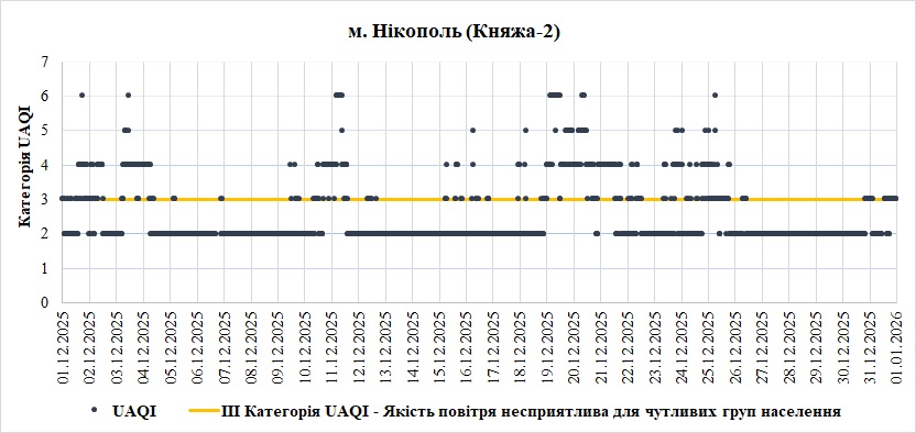 У грудні на станціях в Нікополі переважно спостерігалась задовільна якість повітря. Найгірша якість повітря фіксувалась на станції «Княжа-2». Переважний забруднювач, що найбільше вплинув на якість повітря на станції – дрібнодисперсний пил (PM2.5, PM10).