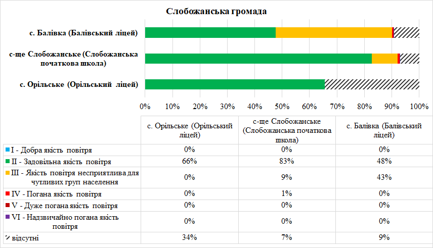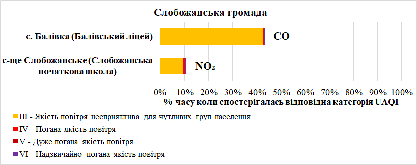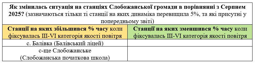 | Станції на яких фіксувалась якість повітря категорії Ⅲ та гірше 5-100% | 2 | с-ще Слобожанське (Слобожанська початкова школа);с. Балівка (Балівський ліцей) |