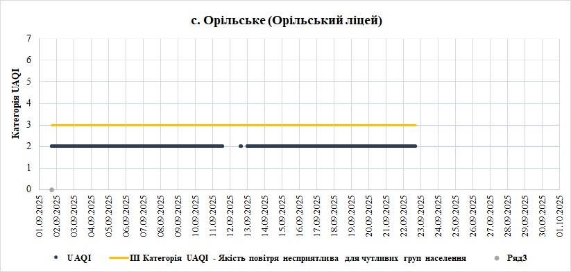 | Станції, на яких якість повітря не перевищувала Ⅲ категорію, або таких значень було менше 5% | 1 | с. Орільське – «Орільський ліцей» |