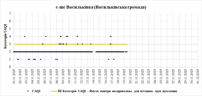 Експерти ЦЕМ проаналізували якість атмосферного повітря у селищі Васильківка за даними зі станції Української мережі громадського моніторингу якості повітря Eco City за Листопад 2025 року. (За листопад дані на станції є лише до 19.11.2025 11:00 включно)