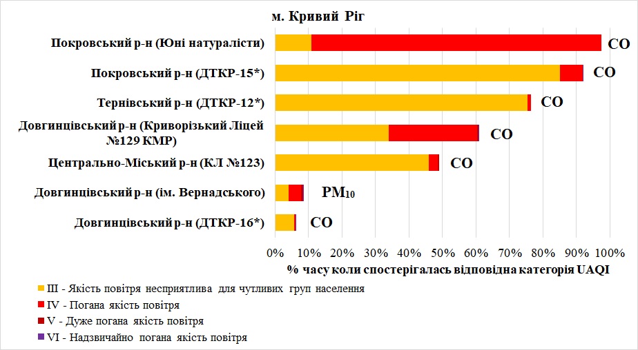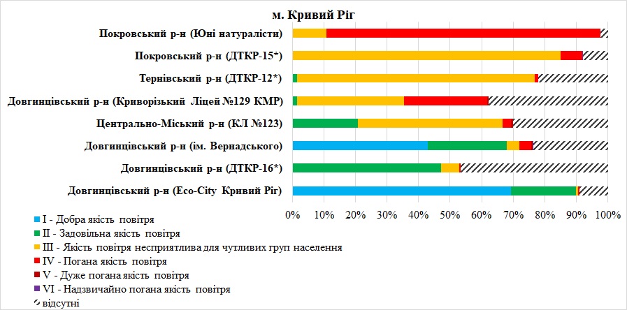 | Станції, на яких якість повітря не перевищувала Ⅲ категорію, або таких значень було менше 5% | 1 | Довгинцівський р-н (Eco-City Кривий Ріг) |