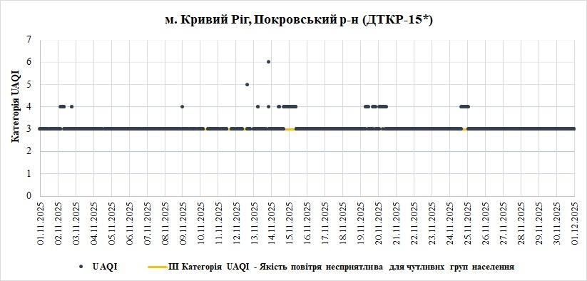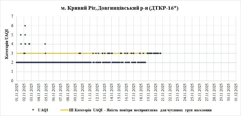 У листопаді найгірша ситуація спостерігалась на станціях «Юні натуралісти» та «ДТКР-15*» у Покровському районі. Переважною забруднюючою речовиною, що найчастіше впливала на індекс якості повітря – монооксид вуглецю (СО).