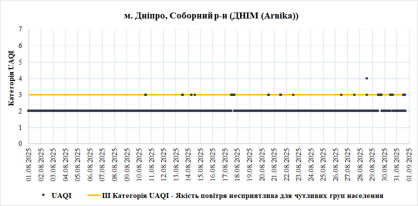 Висновок. У серпні за результатами вимірювання досліджуваних показників у м. Дніпро в трьох локаціях – не зафіксовано перевищення нормативних значень концентрації забруднюючих речовин за час вимірювання.
